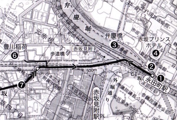 赤坂見附交差点を直進してゆるやかな登り坂を進む。明治地図では青い点線で示している。