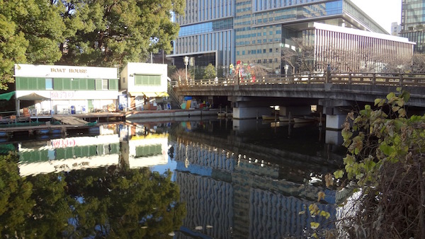 こちらが現在の弁慶橋(3)。手前のお堀ではボート遊びができるようになっている。弁慶橋は弁慶堀に架かっている。武蔵坊弁慶とは無関係で、橋と堀の工事を請け負った弁慶小右衛門から名づけられた。