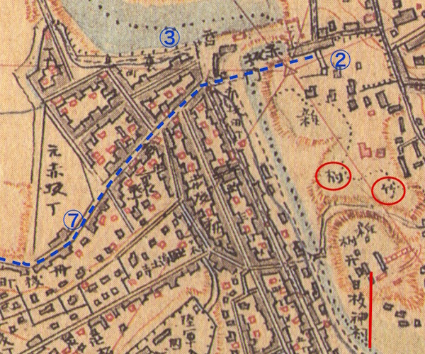 赤坂御門跡の南には日枝神社(赤線)が見える。赤坂御門跡と日枝神社の間は今では赤坂エクセルホテル東急やプルデンシャルタワーなどがあるが、この時代では雑や畑や竹という文字が見える。雑木林や畑や竹林があったことを想像するのも興味深い。