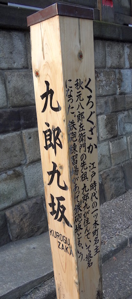 江戸時代の一ツ木町名主秋元八郎左衛門の先祖、九郎九が住んでいて坂名になった。鉄砲練習場があって鉄砲坂ともいう。