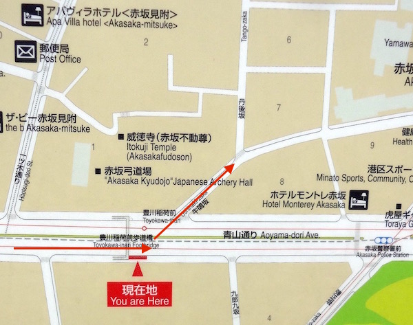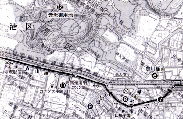 これから(7)牛啼坂を進む。(8)弾正坂や(9)薬研坂を横切り(10)の高橋是清翁記念公園まで行こう。