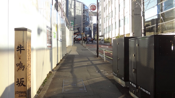 牛啼坂である。道路左側は現在ビルの工事が行われている。こちらは牛鳴坂と書かれている。