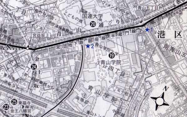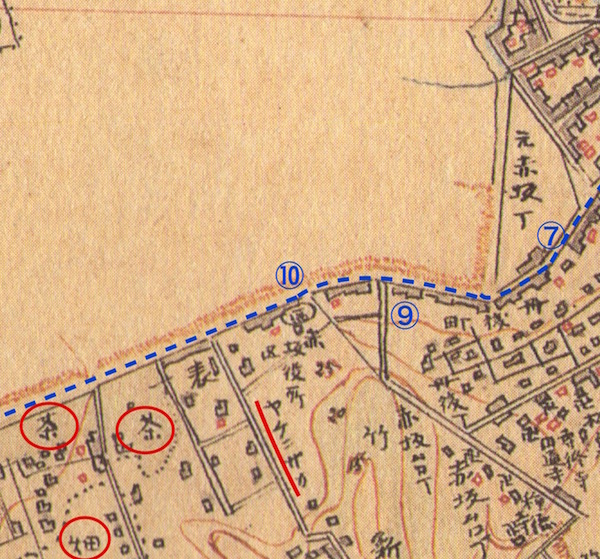 明治地図では(10)に相当する場所である。昔は赤坂役所があったのだろうか。この先の南側には茶や畑の文字が見える。赤坂と青山の間に茶畑があったとは現在からはとても想像できない。