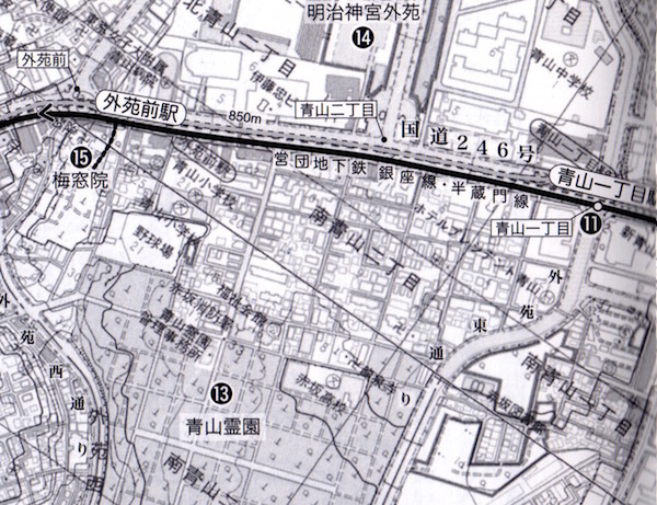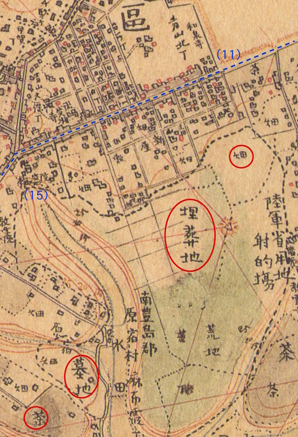明治地図ではおそらく(11)の場所が今の青山一丁目交差点であろう。南側には埋葬地や墓地の文字がみられ現在の青山墓地と一致する。畑や茶という文字も散見される。