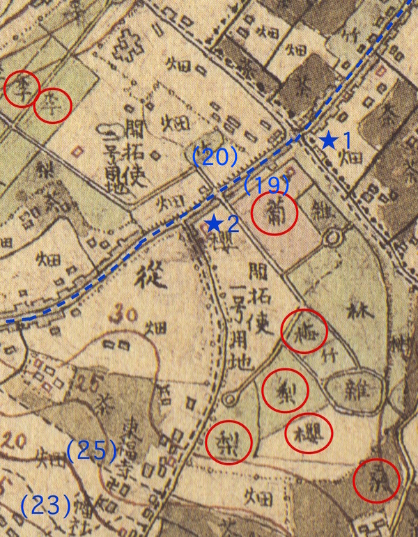 青山学院があるところには葡と書いてある。葡萄畑があったのだろう。他にも梨や李(もも)などの果樹園もあったらしい。梅や櫻や桑の文字も見える。(23)八幡社(金王八幡宮)や(25)東福寺も記載されている。