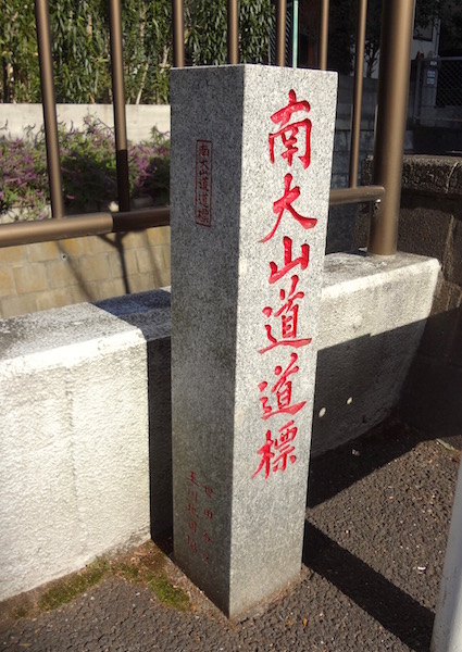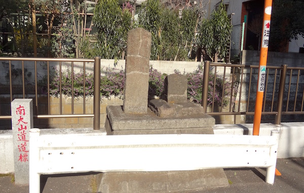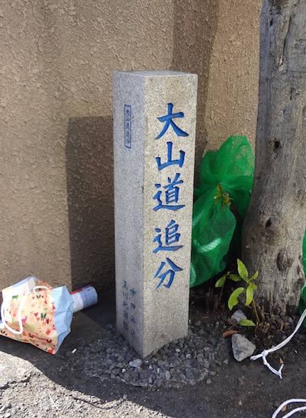 南大山道道標と書いてある。北側を通る上町・慈眼寺線に対して、新町・行善寺線は南側を通るので南大山道となっているのだろう。