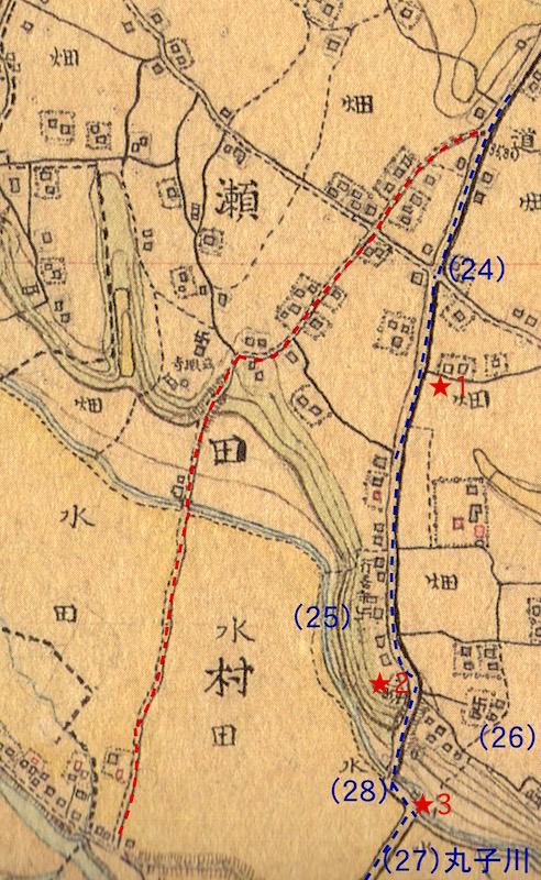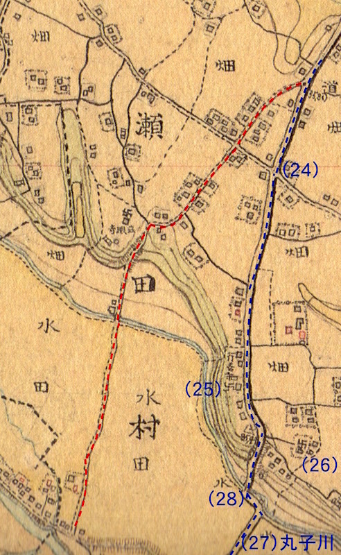 明治地図でも(24)の瀬田交差点は判別できる。赤の点線は上町・慈眼寺線のコースである。