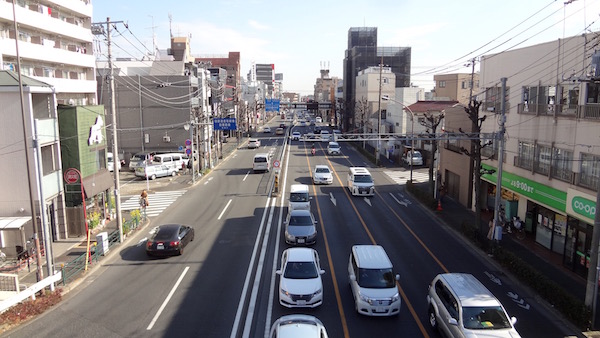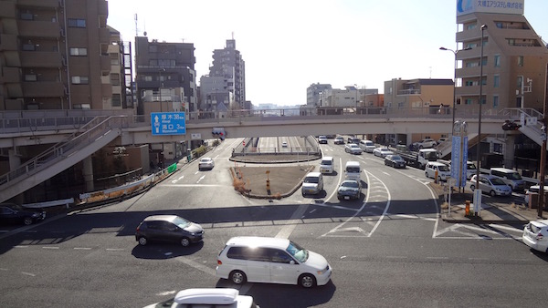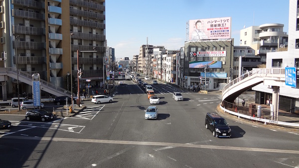 ここが瀬田交差点である。左側の歩道を渡り歩道橋に登る。