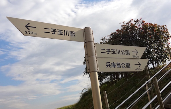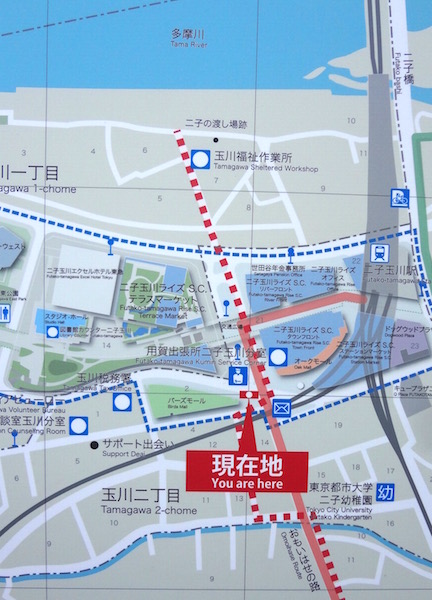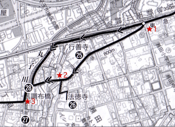 現在地から地図の上方向に進み、二子の渡し場跡を目指す。