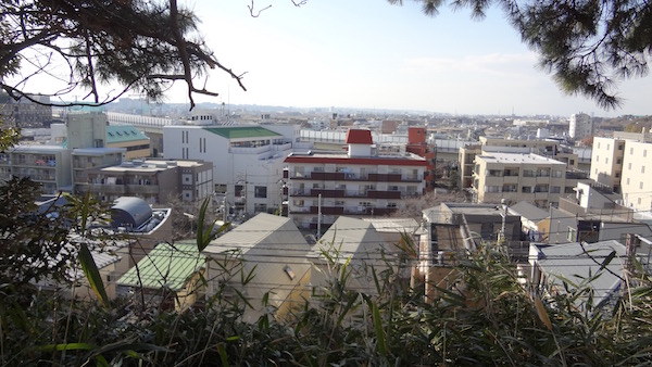 行善寺は多摩川の河岸段丘上にあるため、西側は急な崖になっている。本堂の奥から見下ろすと、こんな風に見える。ビルなどがなかった時代は大山・丹沢の雄姿だけでなく、富士山・奥多摩・秩父連山などが眺望できたようだ。