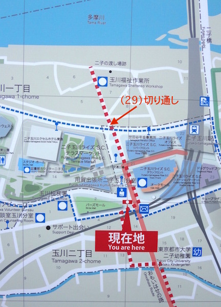 この地図の(29)が切り通しの場所である。赤い点線を通る。