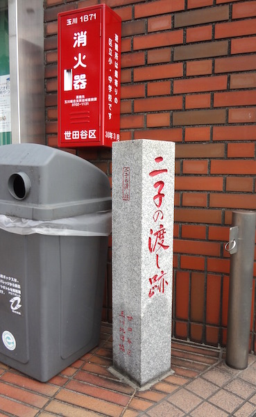 その入口の横にひっそりと二子の渡し跡の碑があった。なかなかわかりにくい場所だった。
