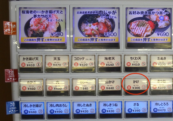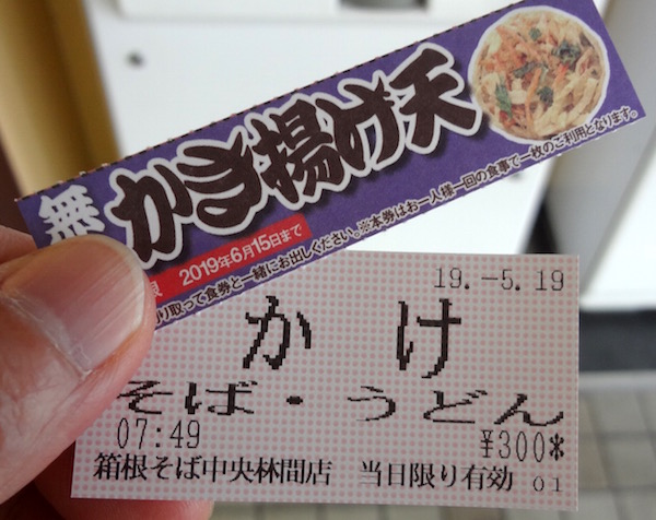 券売機でかけそば300円の食券を買い、かき揚げ天のクーポンを加える。
