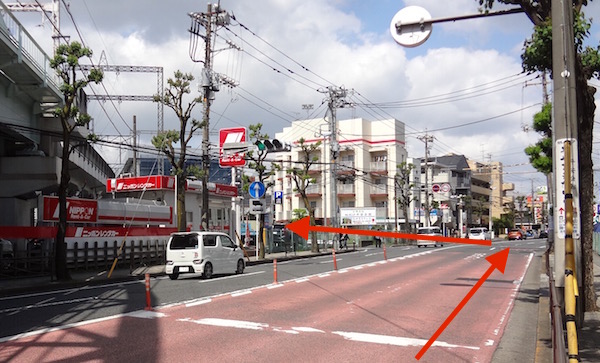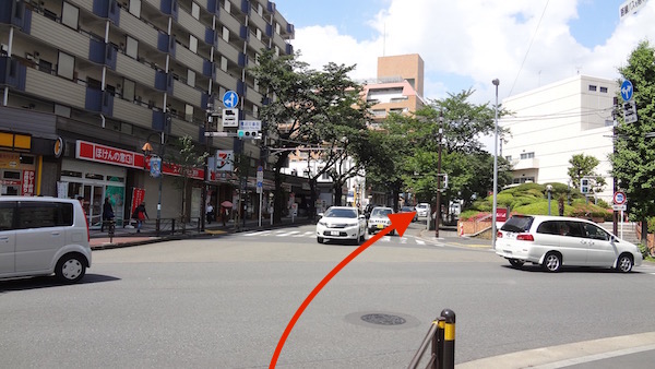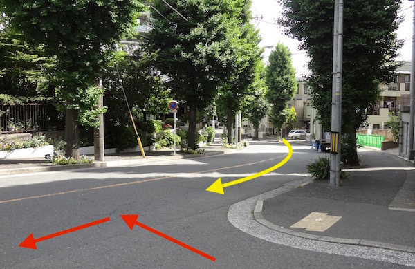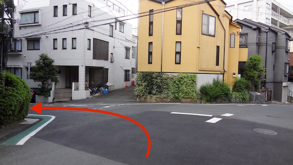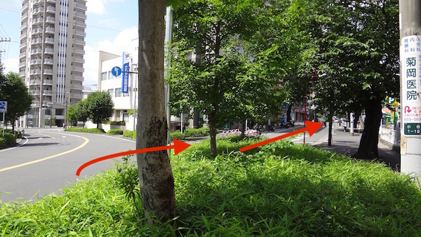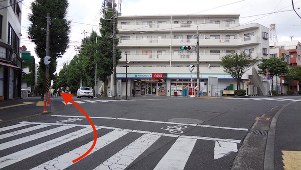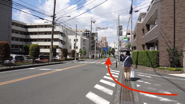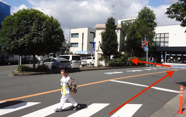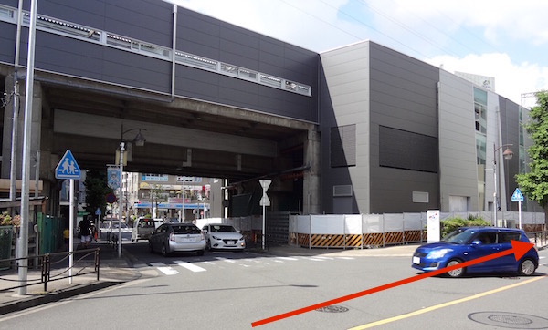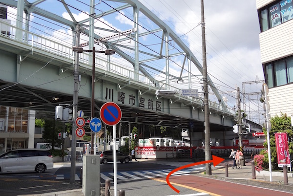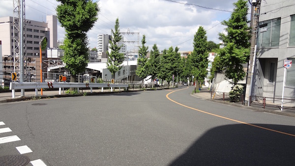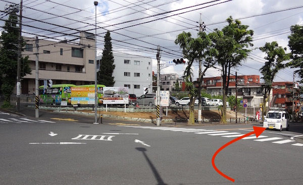左に交番(★4)を見ながら進むと、正面に★5の田園都市線のガードが見える。