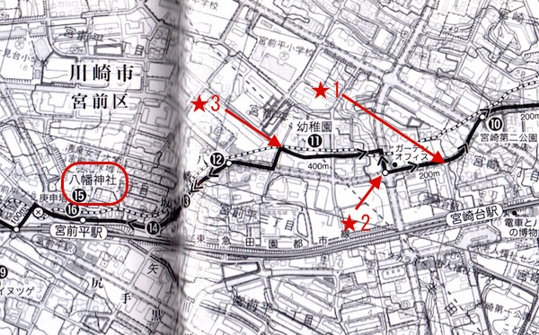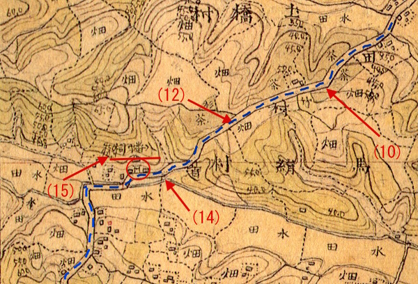 昔は畑の中の道だったようで目印に乏しいが、宮崎第二公園の場所がおそらく(10)の場所だろう。