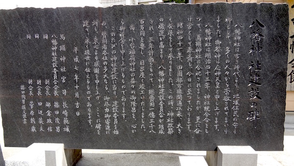 このたびの神社建設に当り、建設委員を始め、賛同者各位の多大なる、御尽力御寄進に対し、衷心より感謝を申し上げ、ここに碑を建て、永く後世に伝えるものであります。