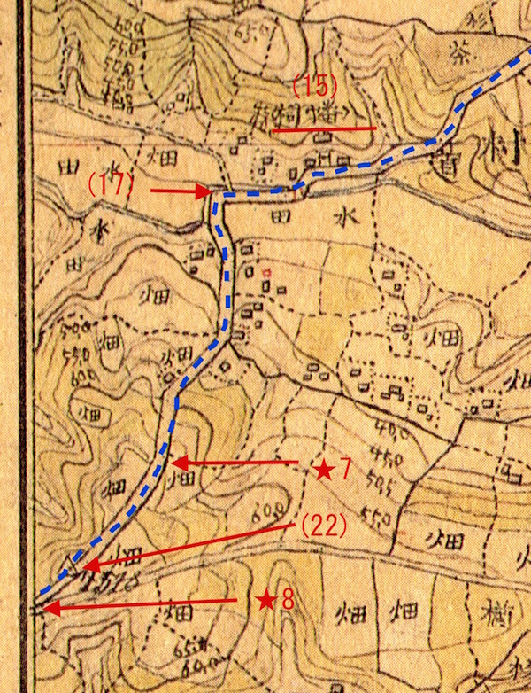 ★8の場所に着いた。手前に(22)の三角点があるはずだが見当たらない。この辺りを三回ほどめぐってみたが見当たらない。明治地図にも三角点のマークがあるがついに探すことはできなかった。