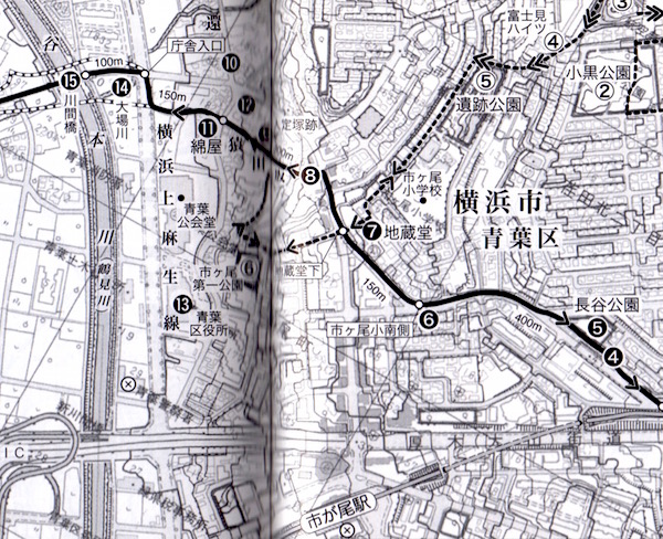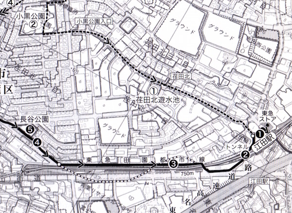 (4)の少し手前で田園都市線のトンネルが見たらそこを右折して登っていく。