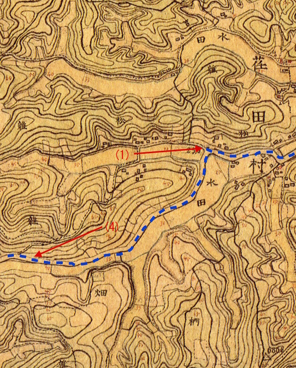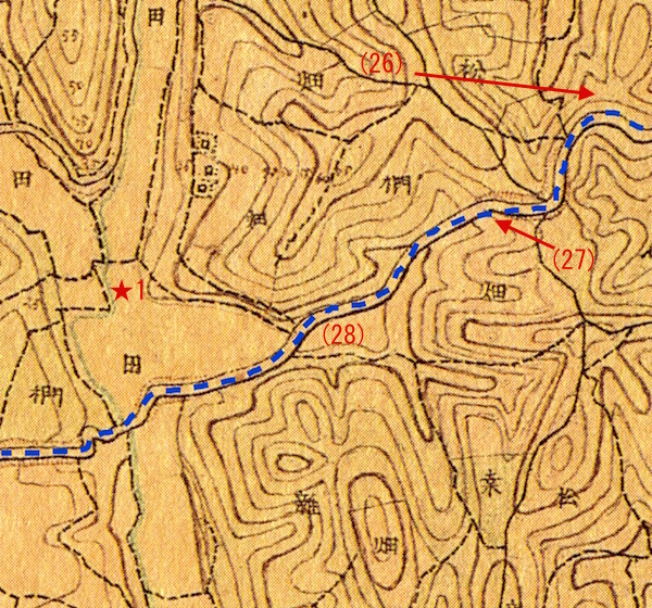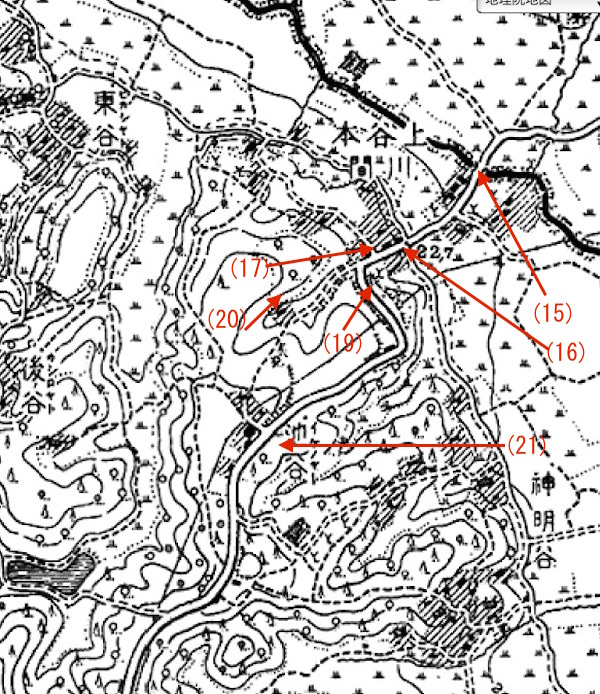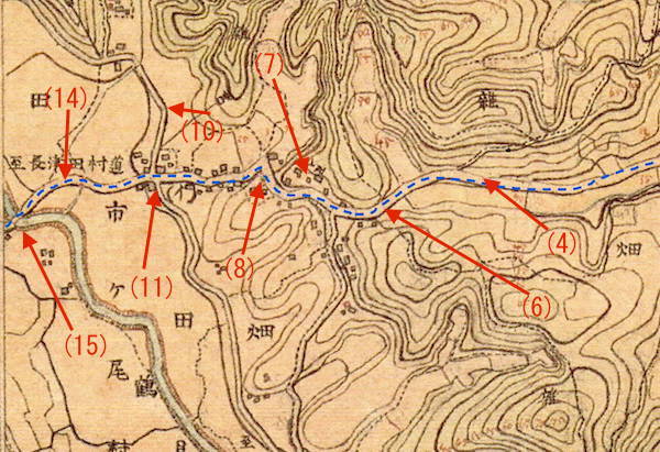 道路と交差する。ここが(10)日野往還である。明治地図にもしっかりと描かれている。
