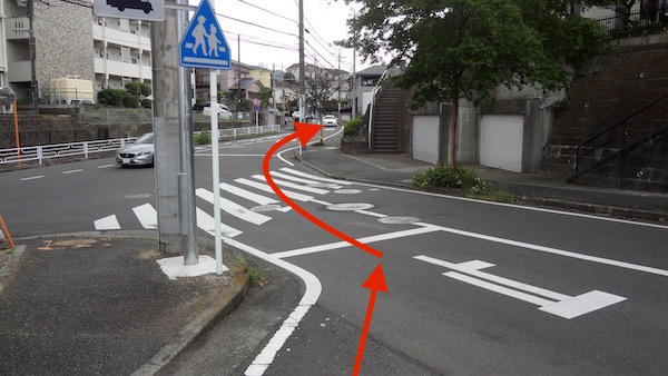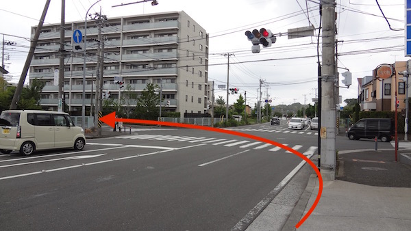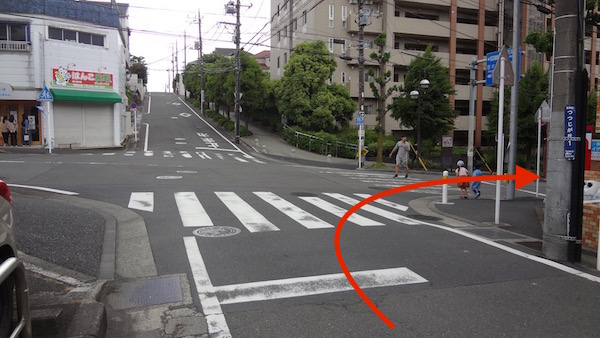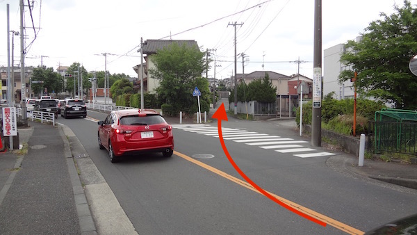 (6)市ケ尾小学校南側交差点の三叉路を右折する。