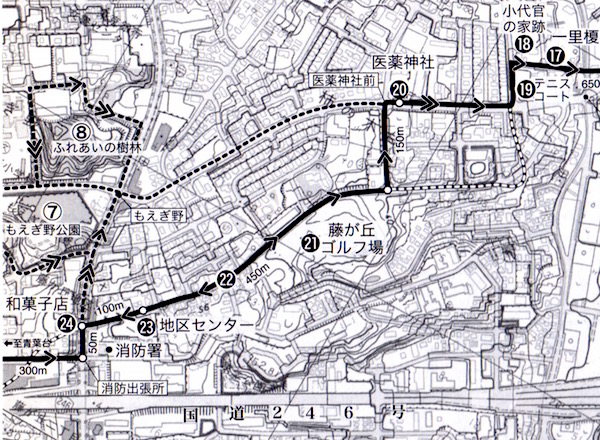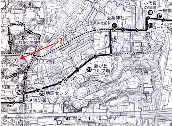 (24)和菓子店からすぐのもえぎ野中学校東側交差点を右折する。(平成地図では「消防出張所」交差点となっているが名前が変わったようだ。)
