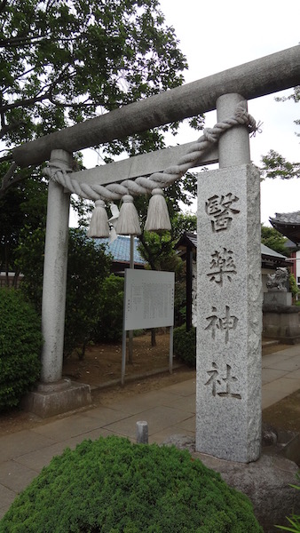 戦国時代末期の天正年間(1573ー1592)、真言宗関東三ケ寺の一つとして創建された醫王山藥師院東光寺の境内に山号の「醫」、寺号の「藥」を取り、「醫藥神社」として祀られたのが始まりという。