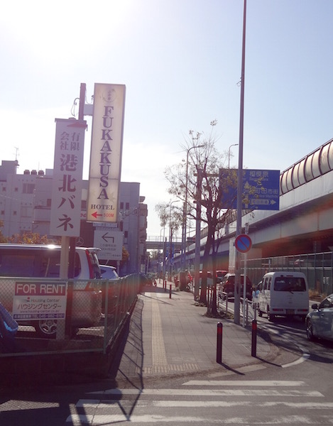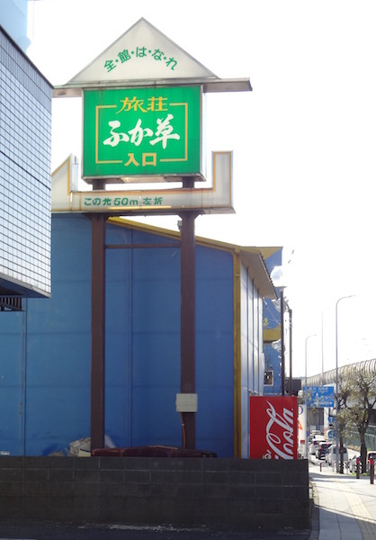 しばらく歩くと、再び「FUKAKUSA HOTEL」という横文字の縦看板があった。ここは左折することができる。