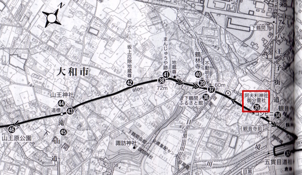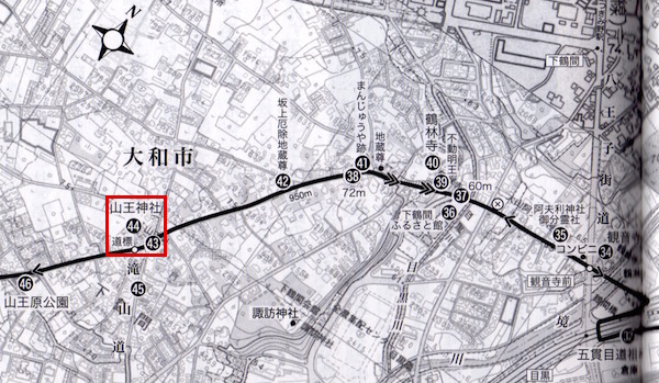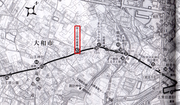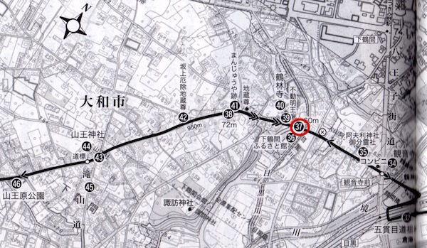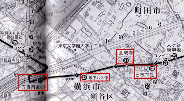 (30)日枝神社、(31)圓成寺、(32)五貫目道祖神、(33)坂下バス停