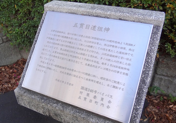 現在の道祖神は徳川後期安政3年丙辰8月と印され、二代目道祖神と言い伝えられております。青山街道は別名大山街道とも言われ、多くの旅人の行来した街道でした。五貫目地域住民も明治時代おり平成の今日迄、毎年1月14日道祖神地先にて1年の無病息災並びに豊作を念じて、左義長別名ダンゴ焼きの行事を実施致しております。