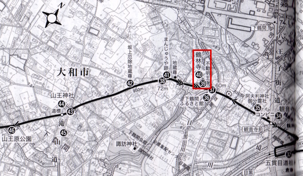 目黒交差点を回り込み、ここを左折する。平成地図の矢印の場所である。