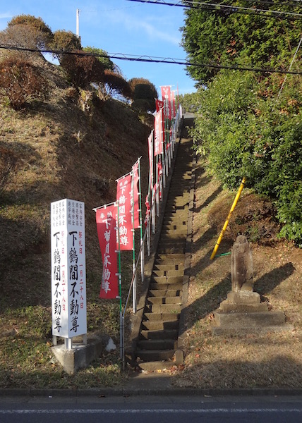 さて歩みを進めよう。登り坂を進むと、右側に「下鶴間不動尊」と書かれた案内板と幟があった。