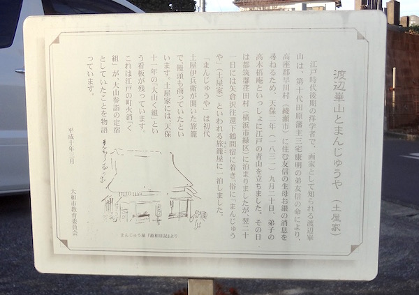 江戸時代後期の洋学者で、画家として知られる渡辺崋山は、第十代田原藩主三宅康明の弟友信の命により、高座郡早川村(綾瀬市)に住む友信の生母お銀の消息を尋ねるため、天保2年(1831)9月20日、弟子の高木梧庵といっしょに江戸の青山を立ちました。その日は都築郡荏田村(横浜市緑区)に泊まりましたが、翌21日には矢倉沢往還下鶴間村に着き、俗に「まんじゅうや」(土屋家)といわれる旅籠屋に1泊しました。