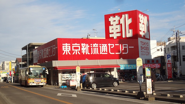 左手に東京靴流通センターがあり、その前には鶴間駅前のバス停がある(逆光なので振り返って撮影)。