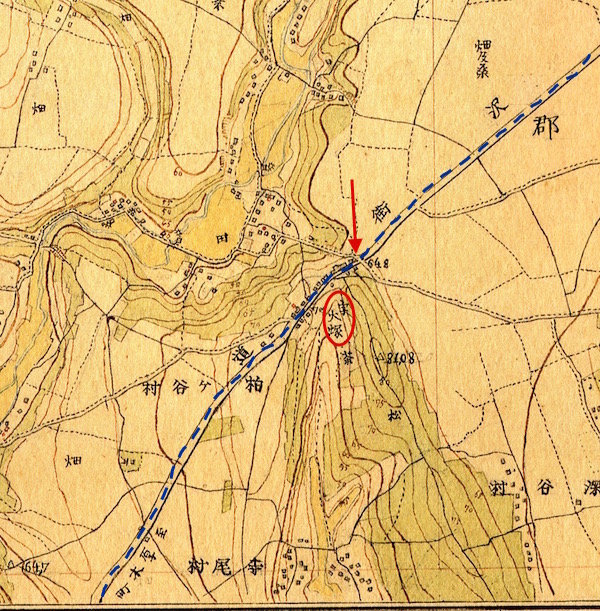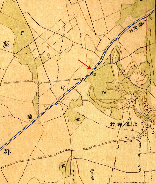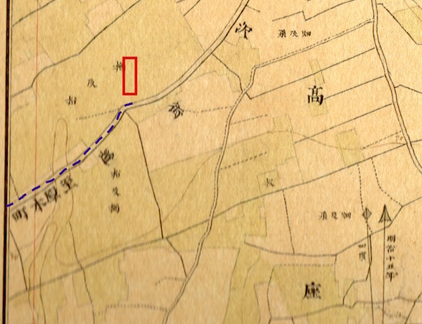 明治地図では赤矢印の場所である。「字 大塚」という地名も下に見える。ここからしばらくは街道沿いに民家が続いていた様子がわかる。