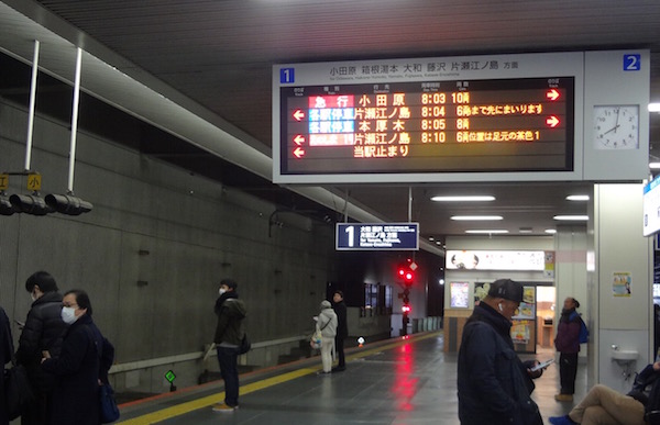 伊勢原駅を7時38分発の電車に乗り、相模大野で8時4分発の各停片瀬江ノ島行きに乗り換える。