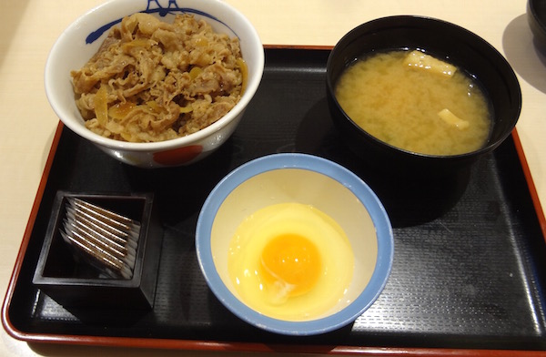 プレミアム牛丼ミニ330に生玉子70を追加した。エネルギーを補充してこれから歩くぞ!