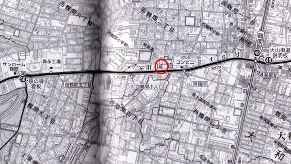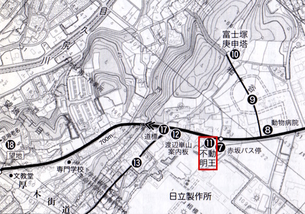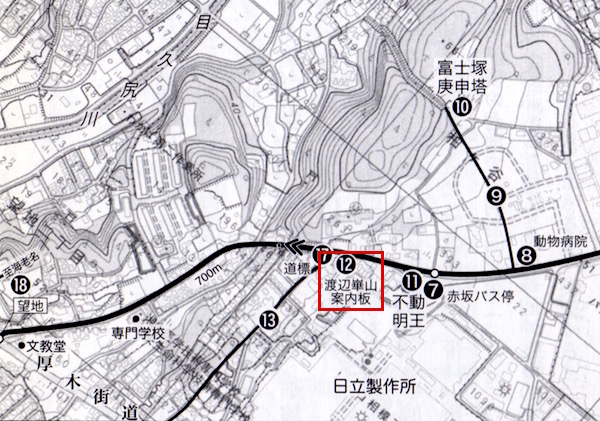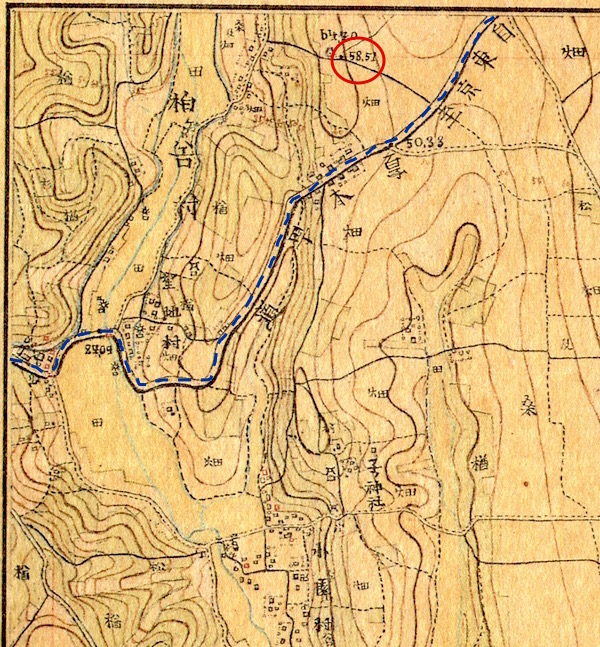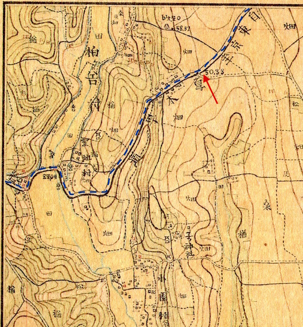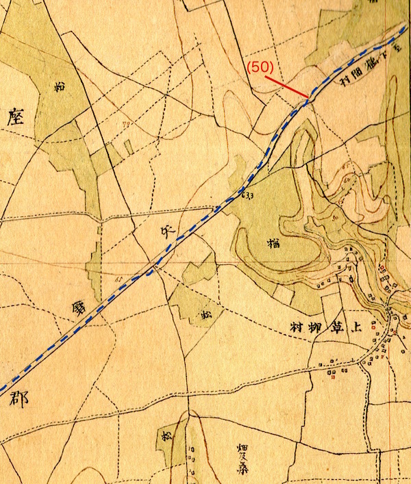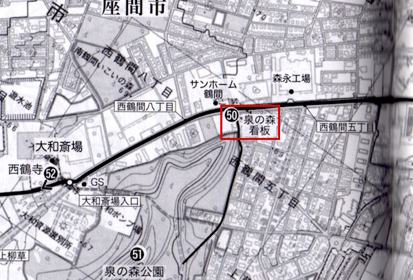 街道の南側の等高線から考えて泉の森看板は(50)あたりだと推測する。