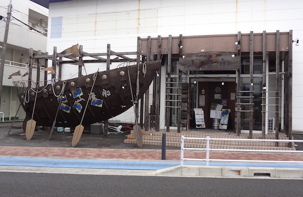 右側には船のオブジェが。居酒屋(とれたて酒場 山海船)の看板だった。
