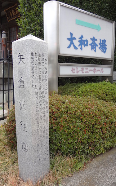 矢倉沢往還(やぐらさわおうかん)。江戸青山(港区)から瀬田(渋谷区)・長津田(横浜市)・伊勢原(伊勢原市)を通過し、矢倉沢(南足柄市)に至る江戸時代の古道。大山街道・青山街道とも呼ばれていました。江戸時代には県内の東西を結ぶ、政治・経済上重要な街道でした。