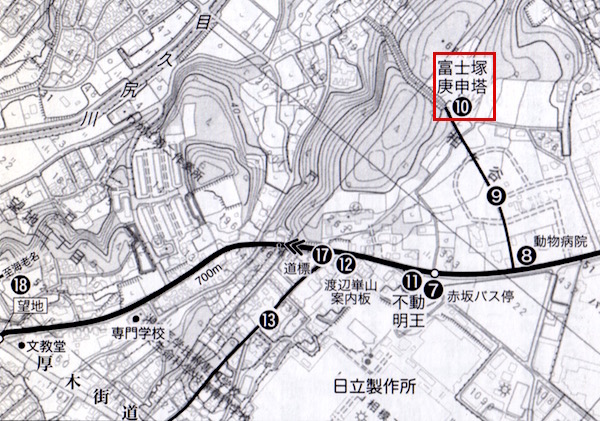 明治地図の富士塚庚申塔の場所は赤丸のあたりと思われる。