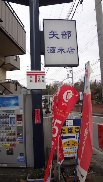 矢部酒米店の柱に大山街道ステッカーがあった。