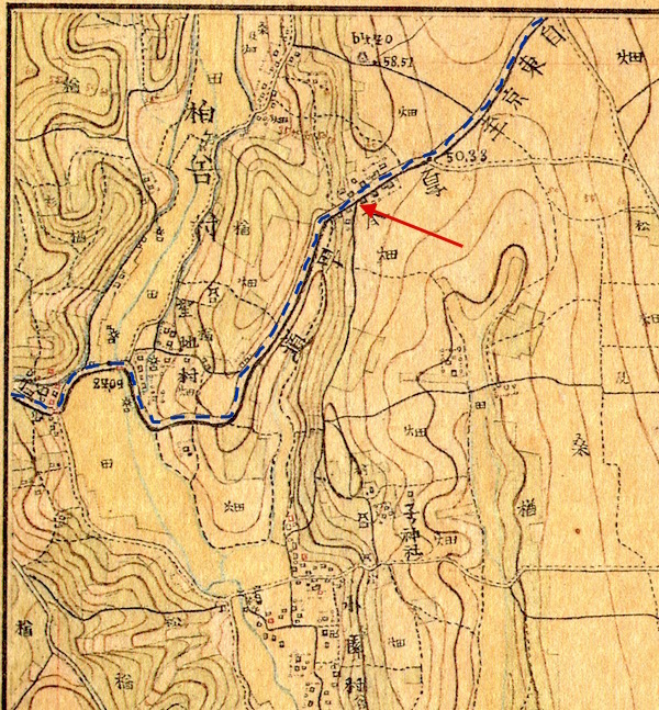 そして左側からの道と合流する。平成地図で青矢印の場所。