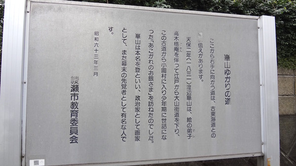 天保2年(1831)渡辺崋山は、絵の弟子高木梧庵を伴って江戸から大山街道を下り、この古道から小園村に入り少年期に世話になった「あこがれのお銀さま」を訪ねたのでした。
