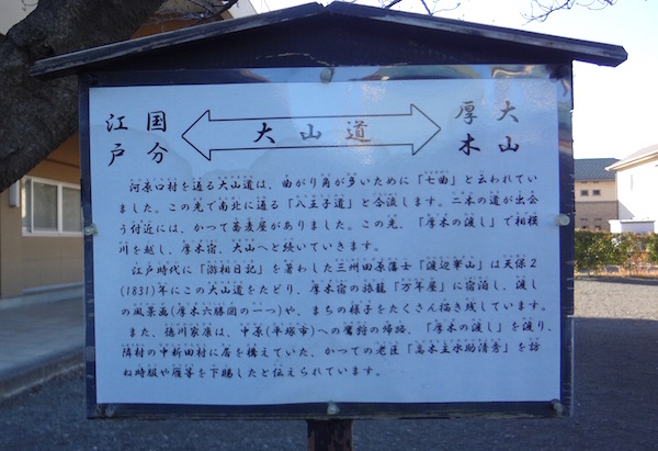 河原口村を通る大山道は、曲がり角が多いために「七曲」と言われていました。この先で南北に通る「八王子道」と合流します。二本の道が出会う付近には、かつて蕎麦屋がありました。この先、「厚木の渡し」で相模川を越し、厚木宿、大山へと続いていきます。