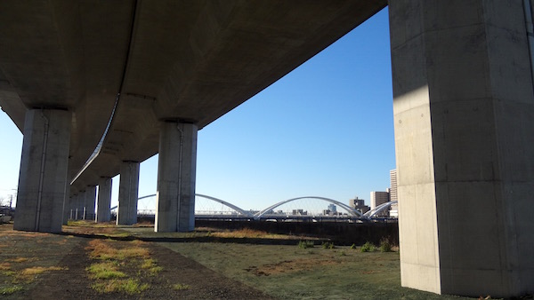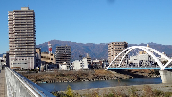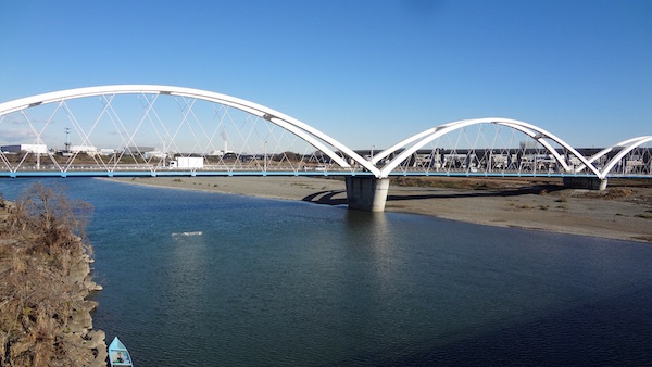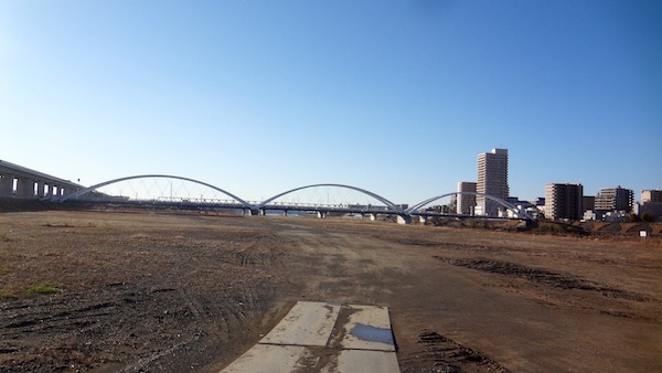 河原から南側を見る。アーチはあゆみ橋。