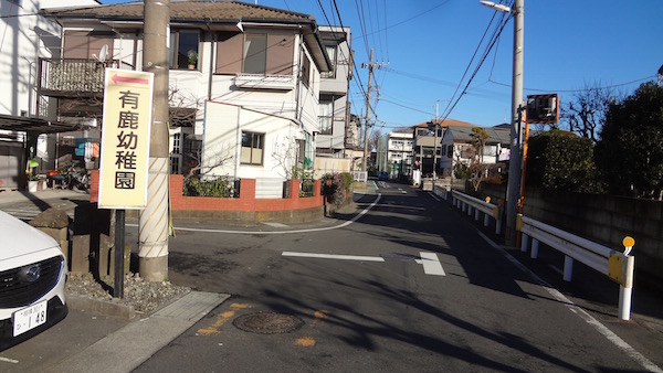 右に曲がると有鹿幼稚園という案内板の下に庚申塔と道祖神が見えている。
