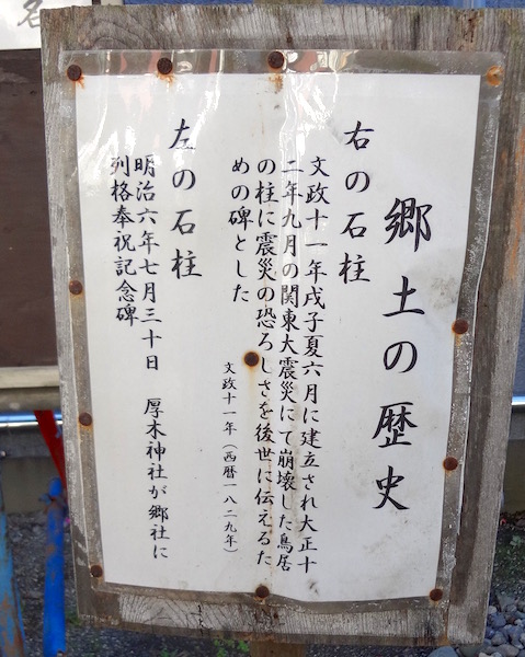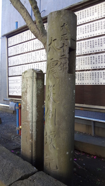 文政11年戌子夏6月に建立され大正12年9月の関東大震災にて崩壊した鳥居の柱に震災の恐ろしさを後世に伝えるための碑とした。 文政11年(西暦1829年)