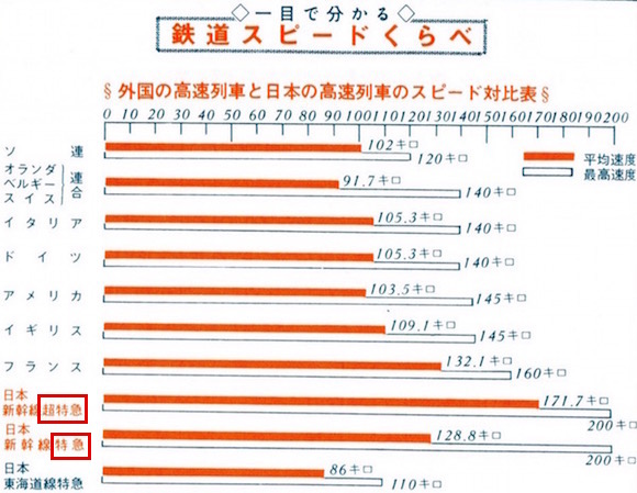 外国の高速列車と日本の高速列車のスピードの比較です。東海道新幹線は群を抜いて第1位になっています。当時はひかり号を新幹線「超特急」と呼び、こだま号を新幹線「特急」と呼んでいたようですね。新幹線「特急」と在来線「特急」との区別が難しそうです。