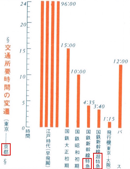 東京〜京都間の所要時間の変遷がでています。東京〜大阪間でないのが面白いですね。それにしても江戸時代の早飛脚の96時間(4日間)というのには笑っちゃいます。新幹線で大幅に短縮されました。