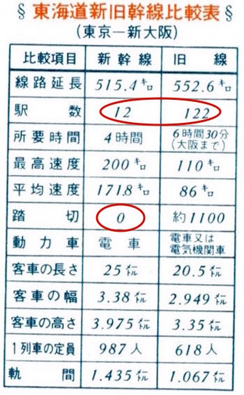 こちらは東京〜新大阪の比較です。線路延長は37.2km短くなっています。駅数が約10分の1となり、踏切0というのが目に留まります。